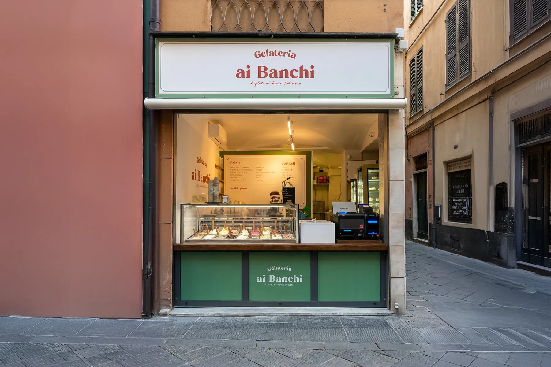 Per Gelateria Ai Banchi abbiamo costruito un nuovo brand partendo dal contesto in cui doveva nascere: il centro storico di Genova, a pochi metri da Piazza Banchi, nel cuore dei carruggi.